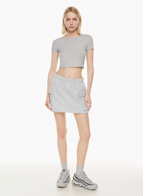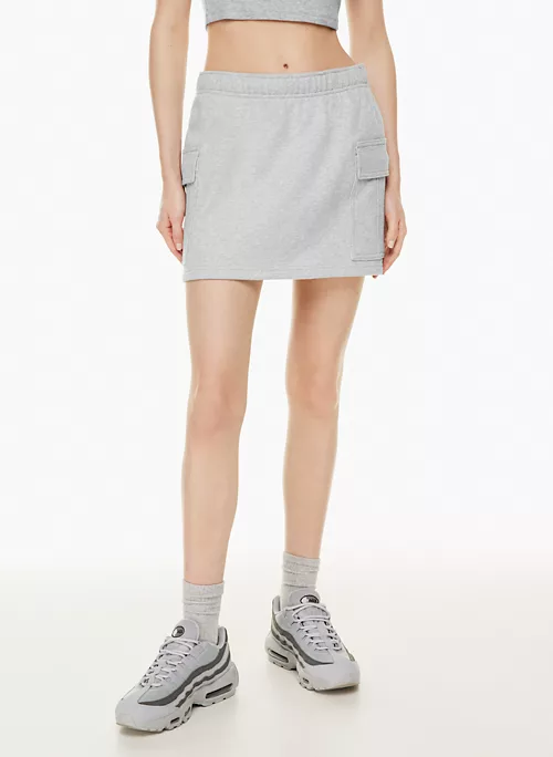 This is a mid-rise mini cargo skirt with an infinity loop drawcord and side cargo pockets. It’s made with TNA’s Terry Fleece — all-season, midweight French terry with a looped back, soft drape and a breezy feel. Très luxe.