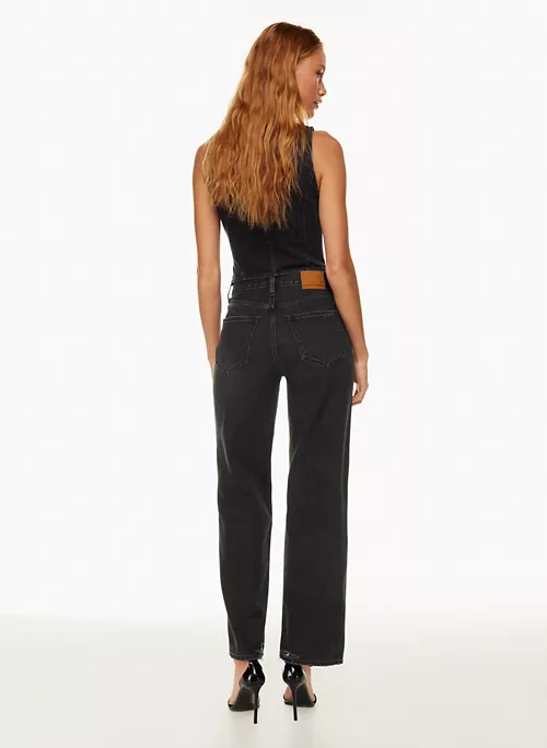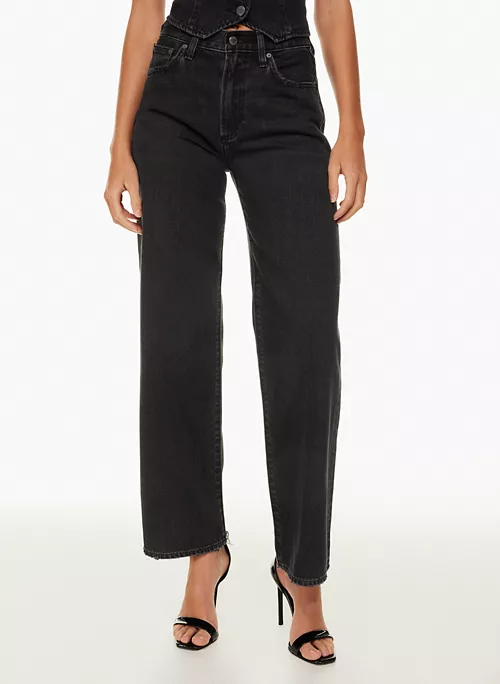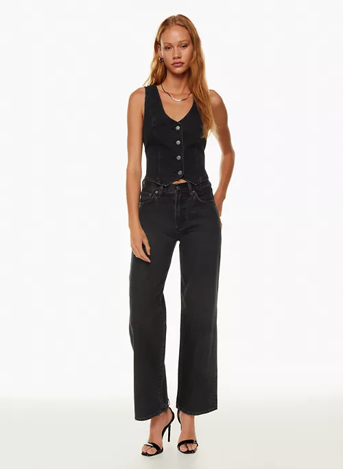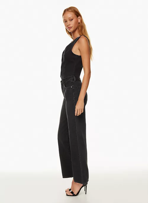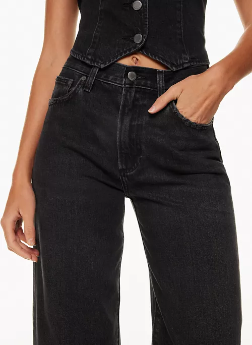 Inspired by bold, adventurous ’70s icons, the Farrah is Denim Forumās signature wide-leg jean. With a high rise and slim hip, the Farrah hugs the figure and flares gradually out from the leg, ending in a clean hem. Premium Italian organic cotton denim only gets better with wear. So go ahead, ride a skateboard. Fight crime. But do it with big hair. This version comes in a black wash.