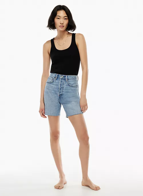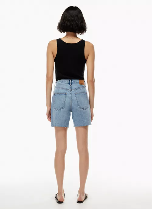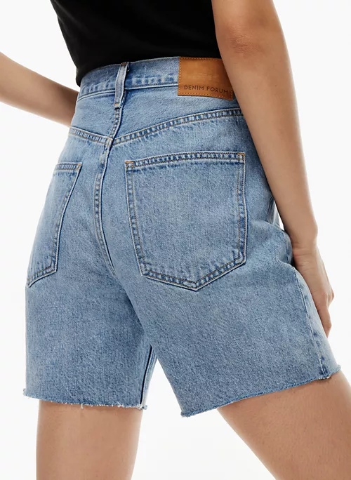 Inspired by the zeitgeist of ā90s grunge, the Joni has a high waist and a loose leg ā much like its taller twin, the Joni Loose jean. These shorts are slouchy, relaxed and down to hang whenever and always, thanks to premium Italian 100% organic cotton denim. This version hits mid thigh, has a raw hem and comes in a medium-light indigo wash.