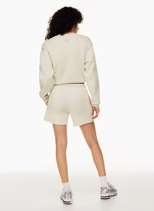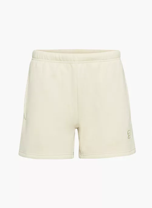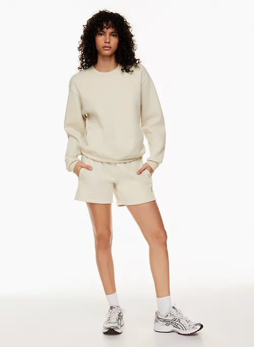 These shorts. These are low-rise sweatshorts with dart hand pockets and a drawcord waist. They’re made from mid-weight fleece with a cozy-brushed inside and a dry, unsueded face.