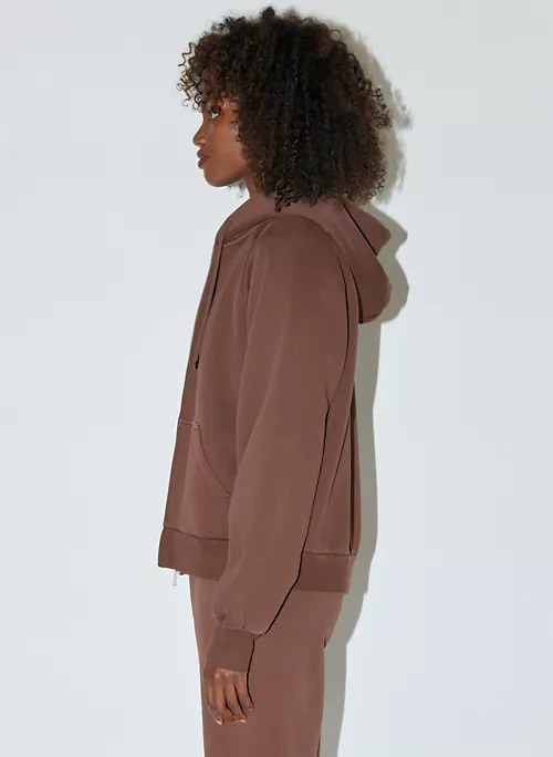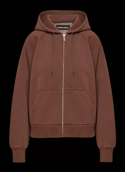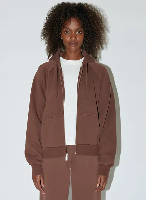 This is a relaxed zip-up hoodie with a kanga pocket and ribbed trim. It’s made from mid-weight fleece with a cozy-brushed inside and a dry, unsueded face. Garment Dye (Gd) Colours: The unique colour of our garment dye is achieved through a special process — instead of dyeing the fabric, we dye the finished garment for a dimensional, washed-down look and soft feel. Results vary from one piece to the next, so yours is truly one-of-a-kind.