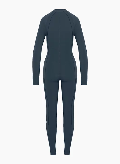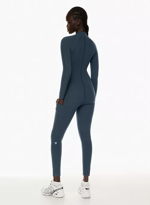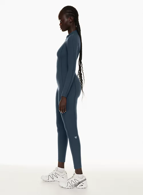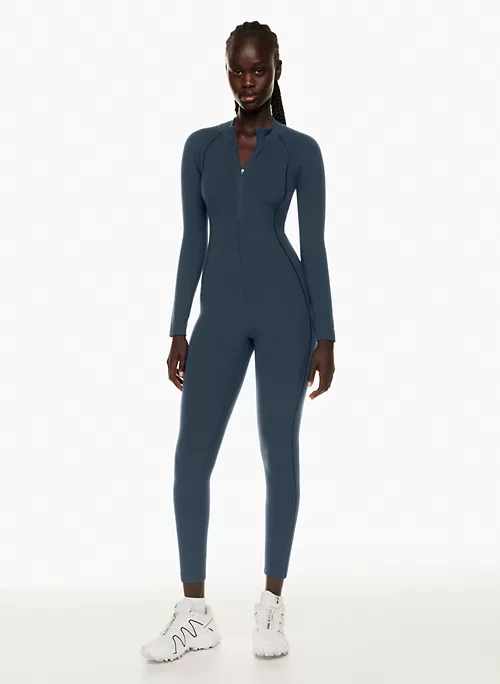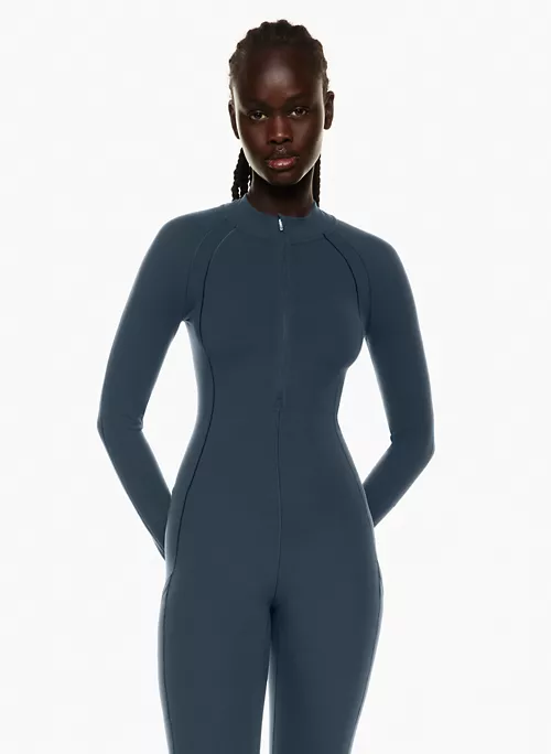 This is a mock-neck jumpsuit with a zip-up front and side drop pockets. It’s made with TnaBREATHE™ — a sweat-wicking, breathable fabric with an ultra-smooth touch and supportive feel.