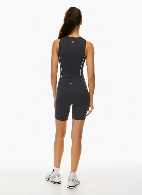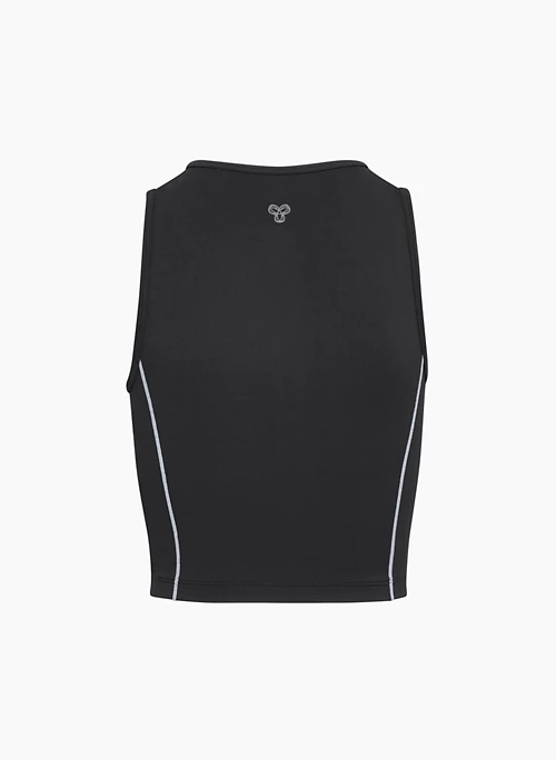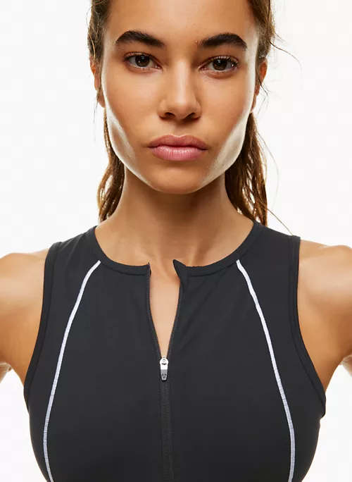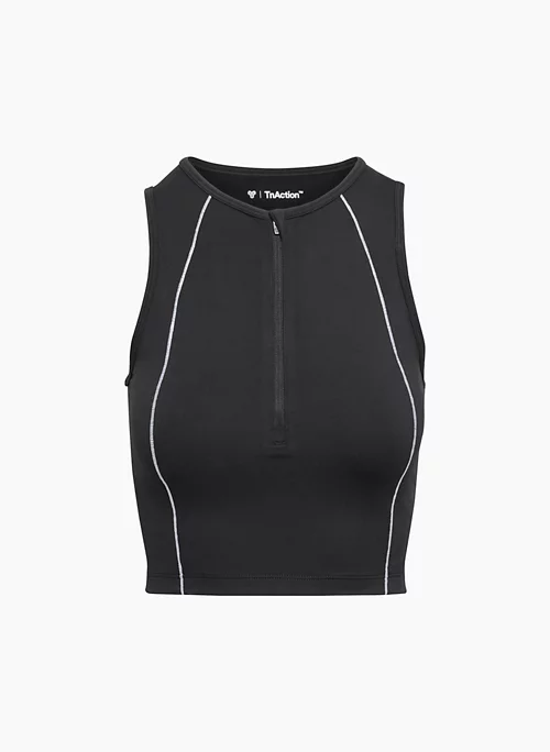 This is a half-zip tank with a crew neckline. It’s made with TnaBREATHE™ — a sweat-wicking, breathable fabric with an ultra-smooth touch and supportive feel.