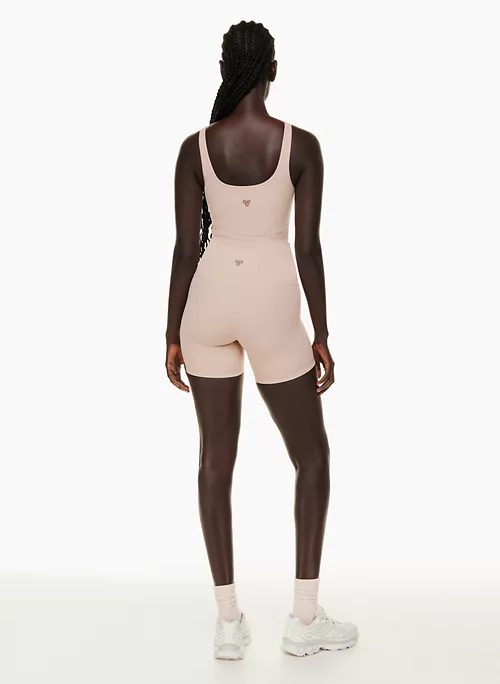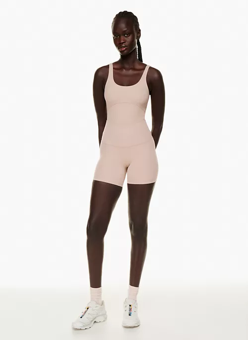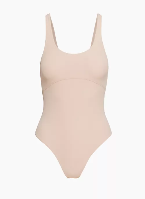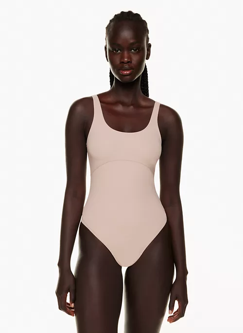 This is a sleeveless bodysuit with a scoop neckline and thong-cut bottom. It’s made with TnaBUTTER™ — a barely there, buttery soft sweat-wicking fabric that shapes to your body.