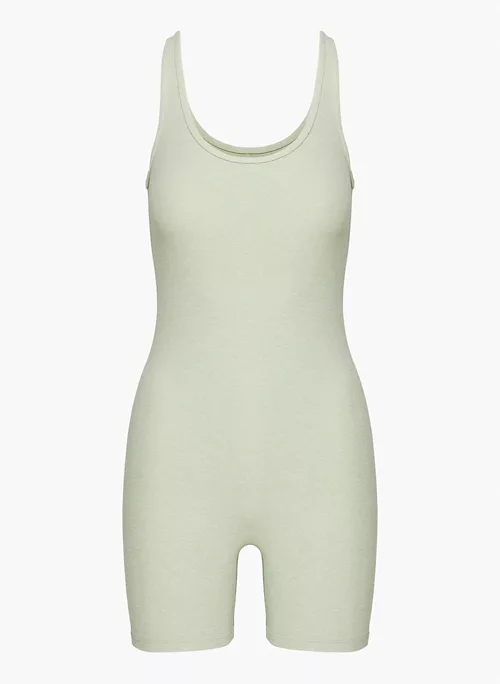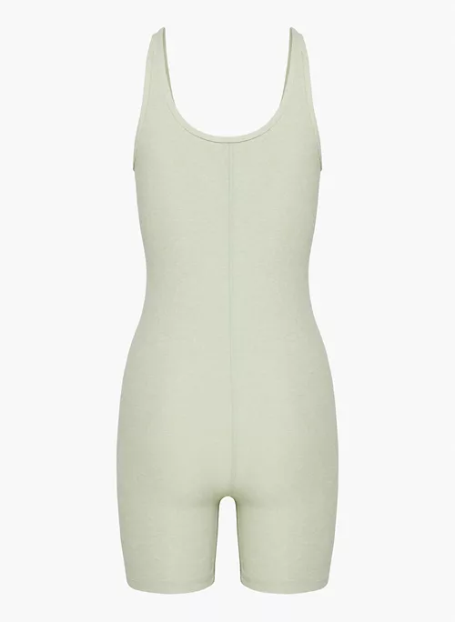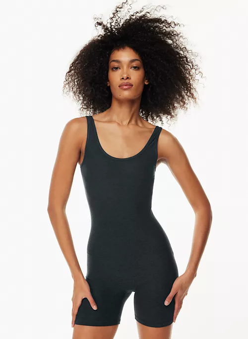 This is a body-hugging romper with a scoop neckline. It’s made with TnaFLOW™ — a super soft sweat-wicking fabric that has a warm, peachy feel and is made with recycled materials.