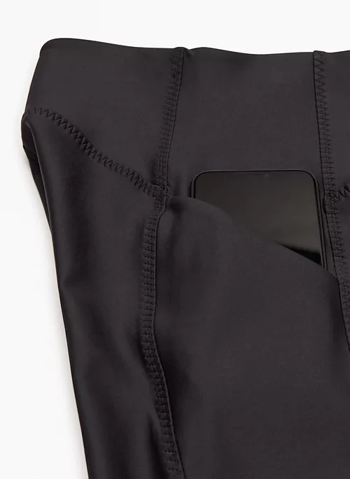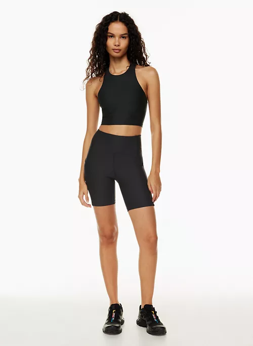 These are high-waisted bike shorts with side pockets, flattering seam lines and our signature wide waistband for a smooth silhouette. They’re made with TnaGLOSS™ — a contouring, body-hugging fabric with a luxe sheen and sleek feel.