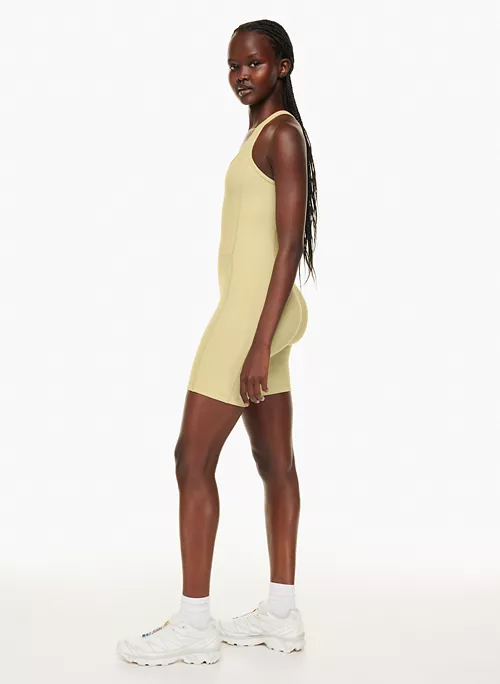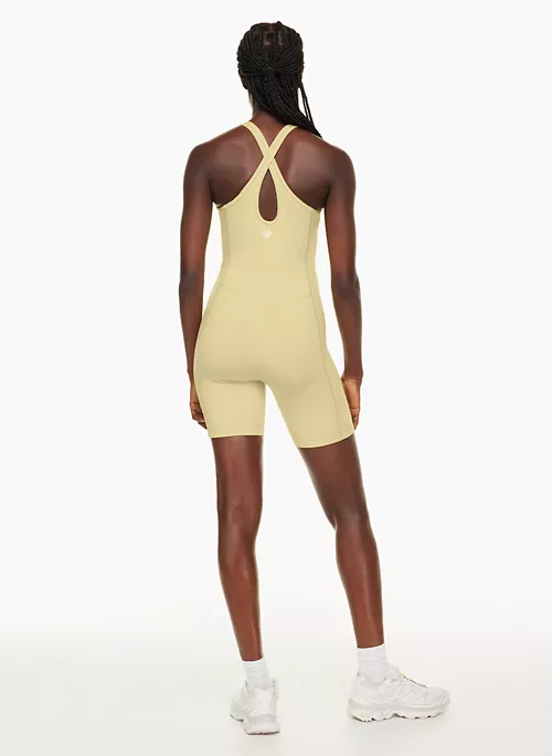 Mentally, at least. This is a scoop-neck romper with crossed back straps. It’s made with TnaLIFE™ — a versatile, body-hugging fabric that’s sweat wicking and cottony soft.