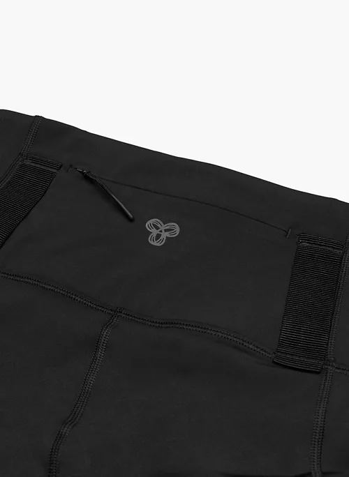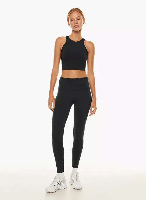 These are hiking leggings with zip-closure drop pockets and a flattering wide waistband that features storage loops. They’re made from TnaSLEEK™ — sweat-wicking and quick-drying fabric with a cool, ultra-slick touch and next-to-nothing feel. It’s made with recycled materials.