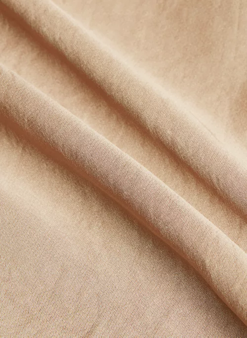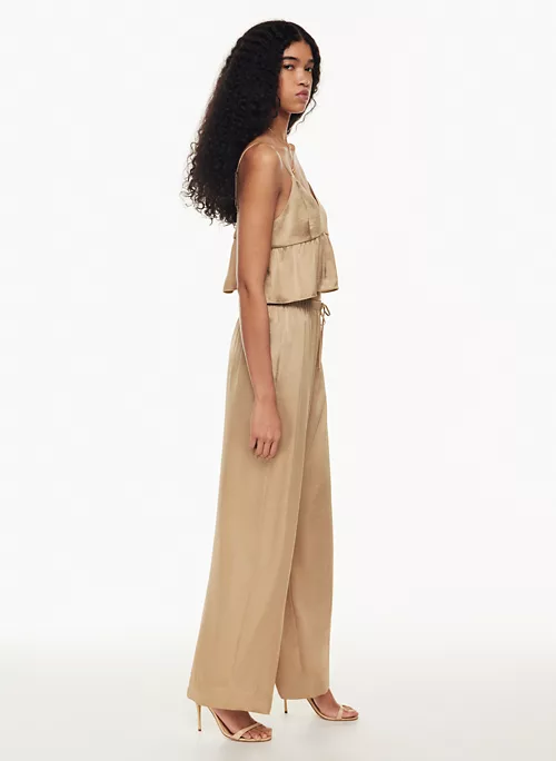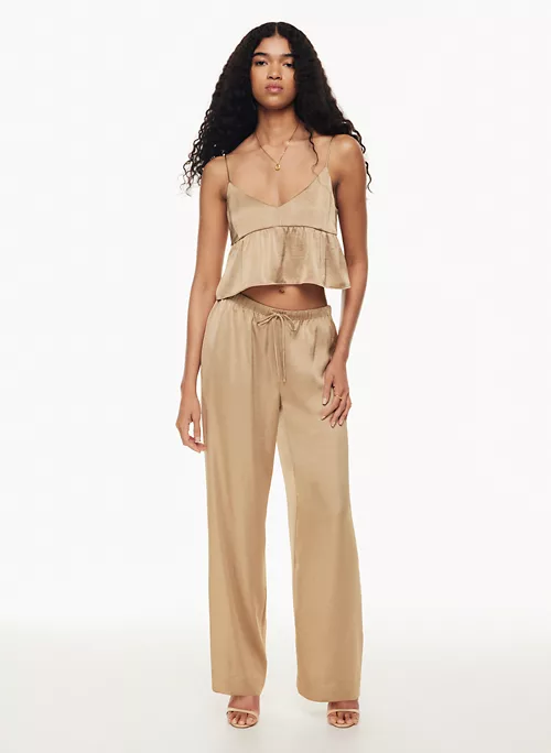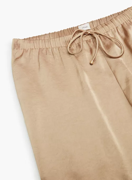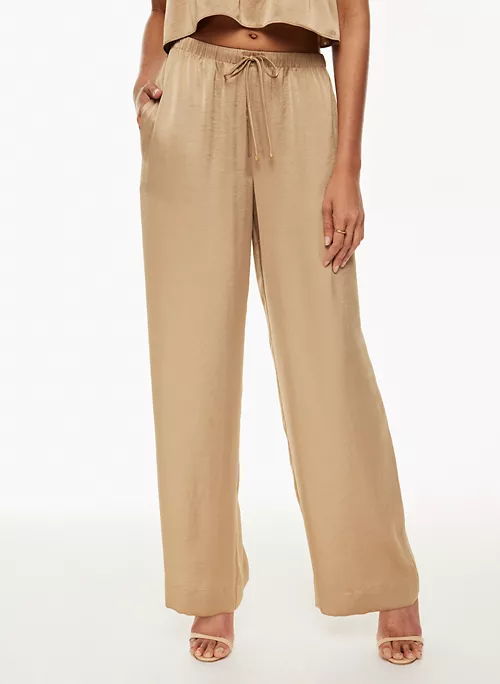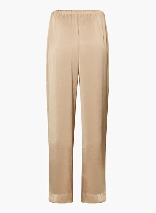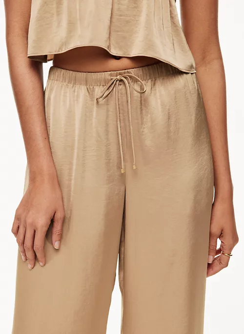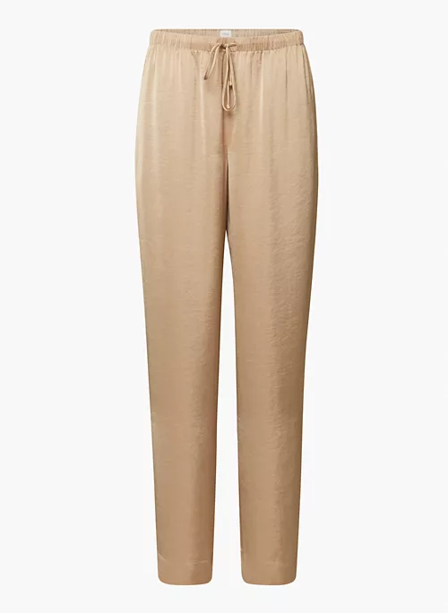 These are mid-rise pants with an elastic waist and inseam pockets. They’re made from Effortless Satin⢠ā drapey, lightweight Japanese satin with a glossy look and feel.