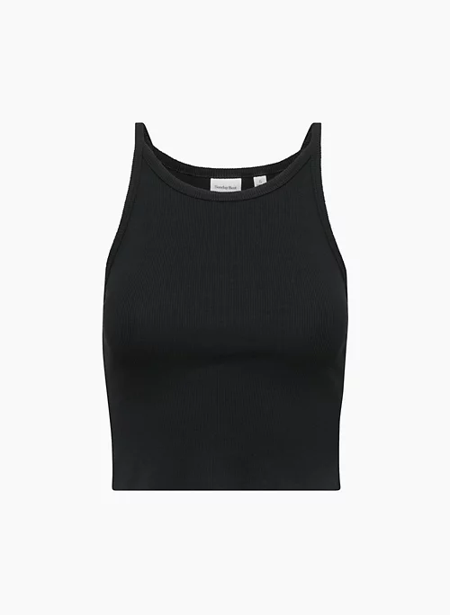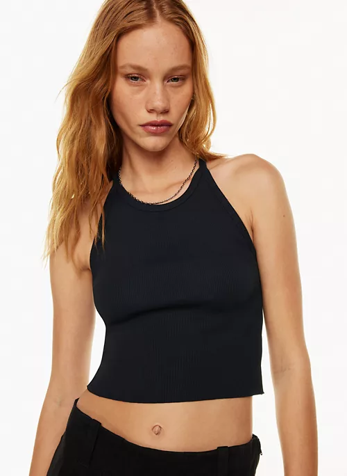 This is a scoop-neck tank with a raw hem. It’s made from ribbed fabric with a soft structure and just-right stretch.