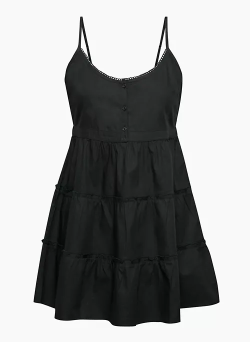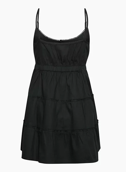 This is a tiered mini dress with adjustable straps. It’s made with soft, lightweight 100% cotton twill.