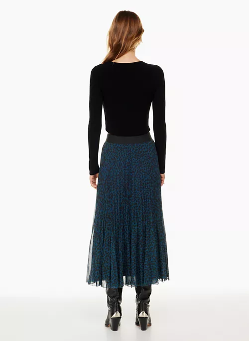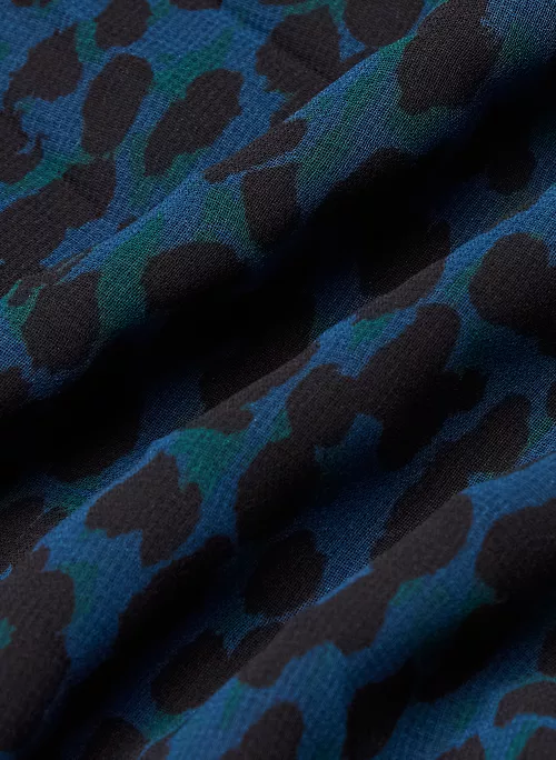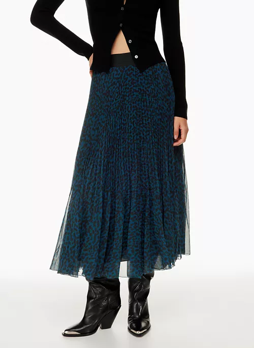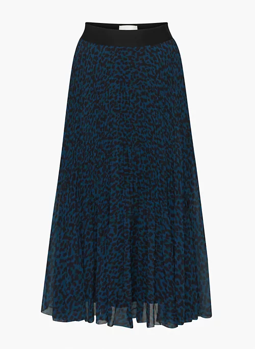 This is a high-rise skirt with an elastic waist and sunburst pleats. It’s made from lightweight semi-sheer chiffon. This version comes in an exclusive animal print that was designed in-house.