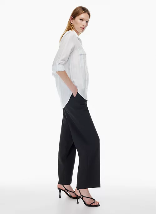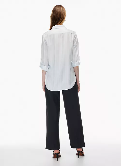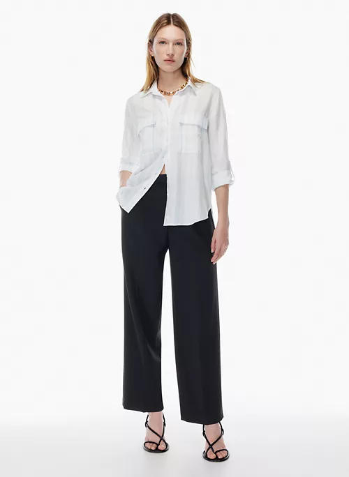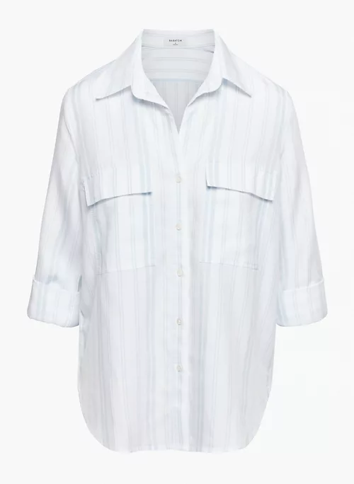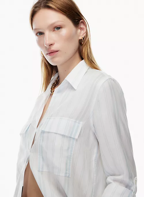 This is a utility-inspired button-up blouse with adjustable sleeves and flap pockets. It’s cut from soft and drapey yarn-dyed twill made with TENCEL™ Lyocell — sustainably sourced wood-based fibres produced through a closed-loop system that minimizes environmental impact.