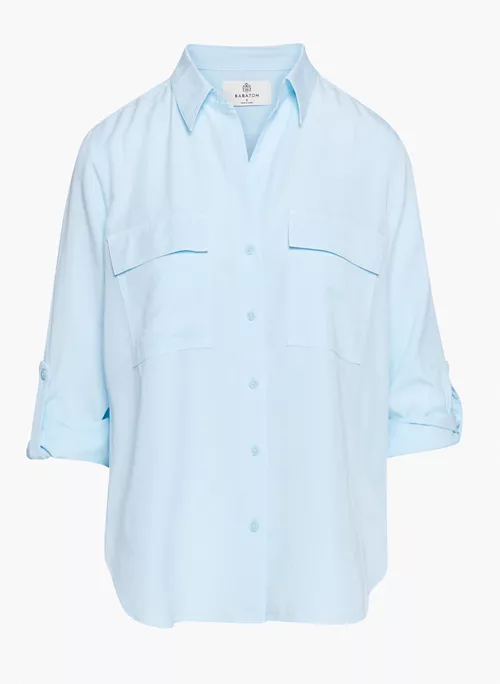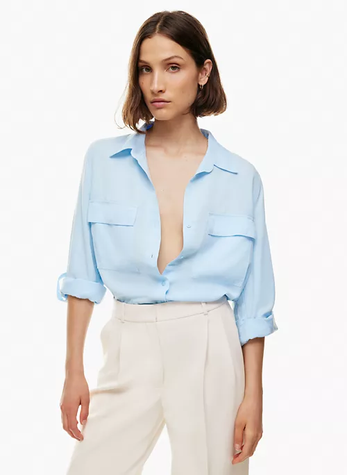 This is a button-up utility blouse with adjustable sleeves and flap pockets. It’s cut from soft, drapey twill that’s made with TENCEL⢠Lyocell ā responsibly sourced wood-based fibres produced through a closed-loop system that reduces environmental impact.Ā
