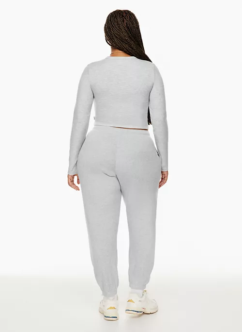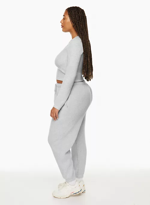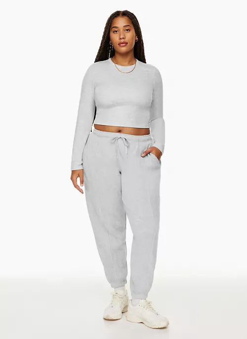 These are mid-rise joggers with an elastic waistband and dart pockets. They’re made from cozy, heavyweight waffle-knit fabric.