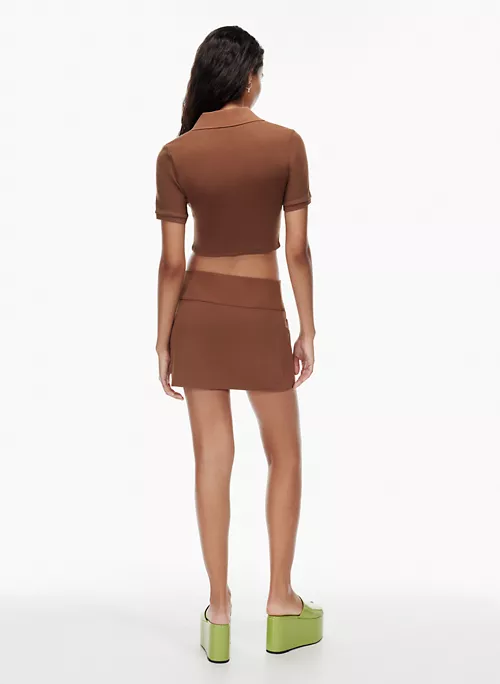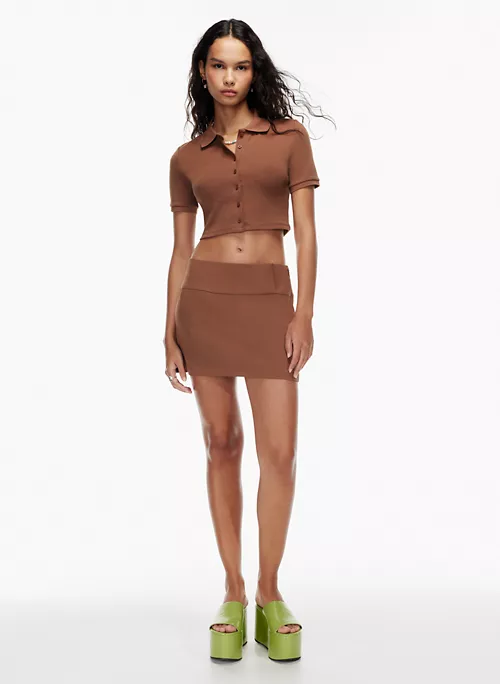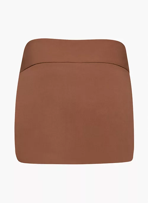 This is a mid-rise mini skirt with an invisible side zipper and a snap-closure waist. It’s made with soft, bi-stretch twill made with recycled materials.