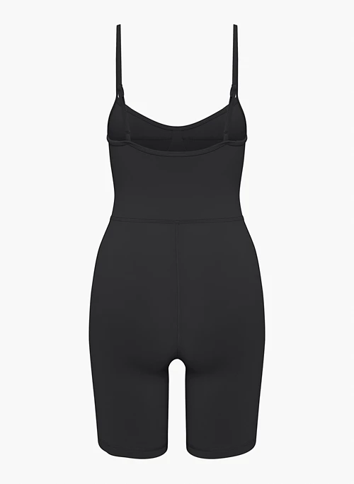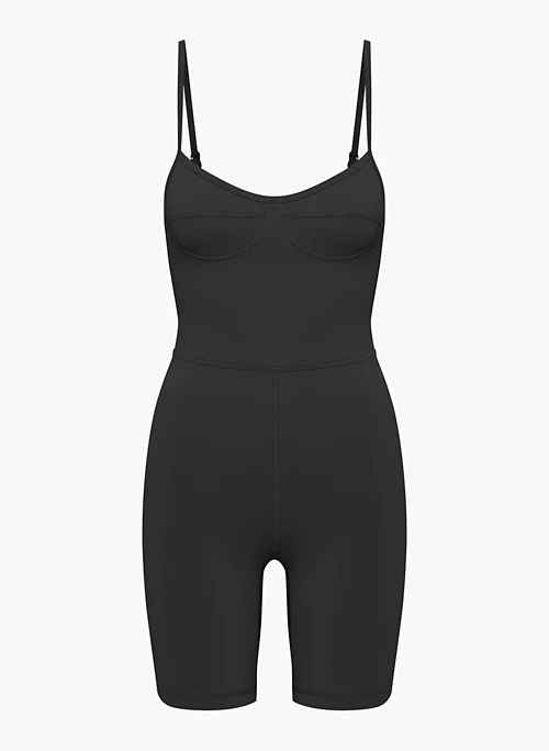 This is a bustier romper with adjustable straps. It’s cut from high-stretch, sweat-wicking jersey with a cool, smooth feel.
